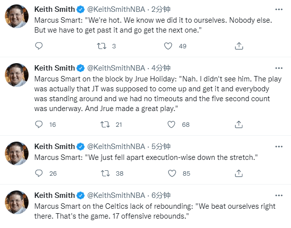 斯玛特还表示:他们有 17 个前场篮板,我们输给了自己,这就是比赛,很艰难,但我们必须继续前进;斯玛特还直言他们是卫冕冠军。