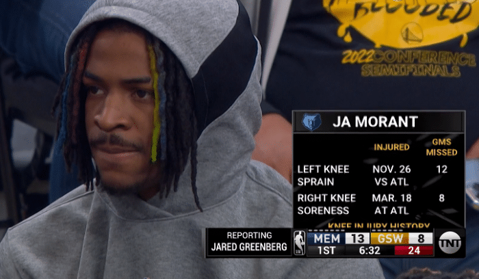 本赛季,莫兰特两次遭遇膝盖的伤病——左膝扭伤缺席12场比赛,右膝酸痛缺席了8场比赛,莫兰特缺席时灰熊战绩出众;不过莫兰特在季后赛是否上场,对球队的影响很大,对阵勇士系列赛更是场均轰下38.3分6.4篮板8.3助攻3抢断。