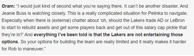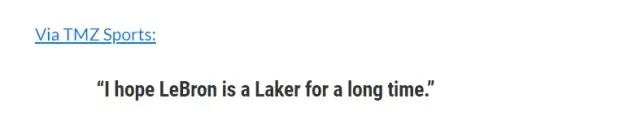 此前,NBA名记布莱恩-文霍斯特在节目上表示,詹姆斯本人同样不愿意离开湖人。"勒布朗想要(继续)成为一名湖人球员,他想要生活在洛杉矶,也喜欢生活在洛杉矶……他仍然相信他能带领湖人抵达巅峰,他想(继续)成为一名湖人球员。”湖人队记Oram透露,球队不会考虑交易詹姆斯或者浓眉。“湖人是否该送走戴维斯或詹姆斯重建?据我所知,湖人不会考虑上述任何一种选择。”