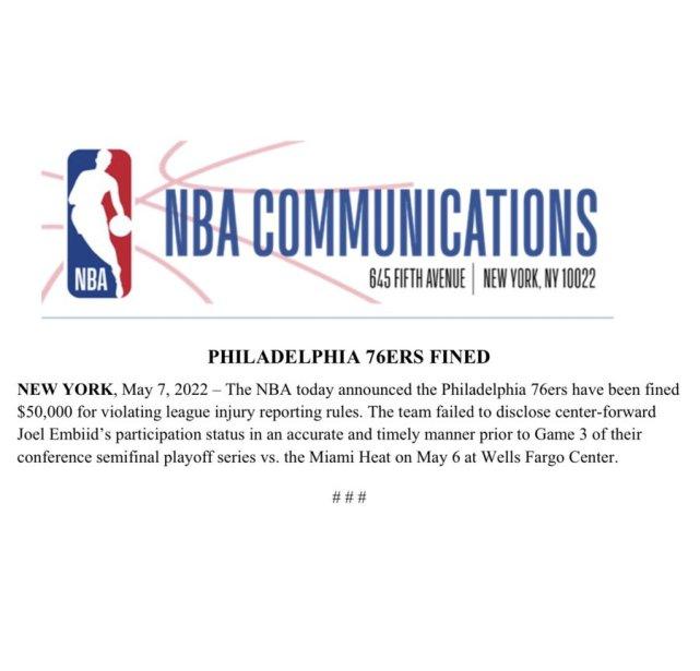 NBA官宣罚单!76人违规被罚5万美元 G3未及时更新恩比德伤情