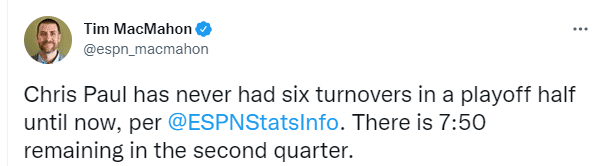 保罗37岁生日夜就像迷失自我似的,半场7次失误距离季后赛生涯单场8次失误仅差1次,不过第二节后半段,当太阳落后到14分时,保罗中投得分,外线三分也有,连续得分打停独行侠,期间布里奇斯吃到技术犯规,东契奇带队稳住局面,保罗防守时被东契奇撞倒,卢卡夸张模仿,质疑保罗假摔。