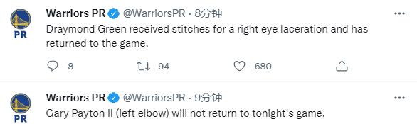 勇士官宣伤情!格林右眼被打肿缝针治疗,专家担忧小佩顿手肘骨折
