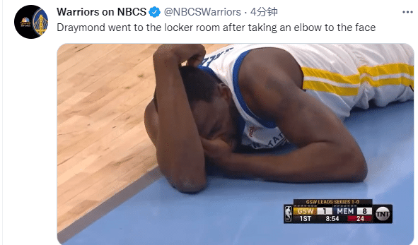 第一节8分54秒,格林惨遭蒂尔曼肘到面部,捂着面部痛苦倒地,裁判没有任何吹罚;格林返回更衣室,离场时冲着灰熊球迷竖中指;勇士官方宣布格林有眼附近撕裂,缝针后回到比赛。