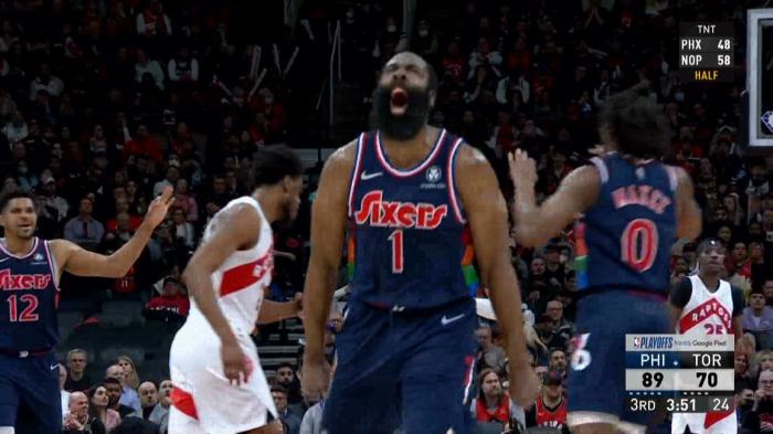 下半场,猛龙集体断电,76人在4分钟打出17-0超级攻势,猛龙艰难得分,哈登投进招牌后撤步三分,仰天怒吼庆祝,美媒直呼哈登回来了,此时76人领先猛龙22分;哈登继续助攻串联队友,打着打着恩比德和布歇有点小摩擦,猛龙全场球迷怒骂恩比德,大帝掩耳示意球迷再大声点,第三节最后一攻,恩比德大帽后冲猛龙球迷摇手指。