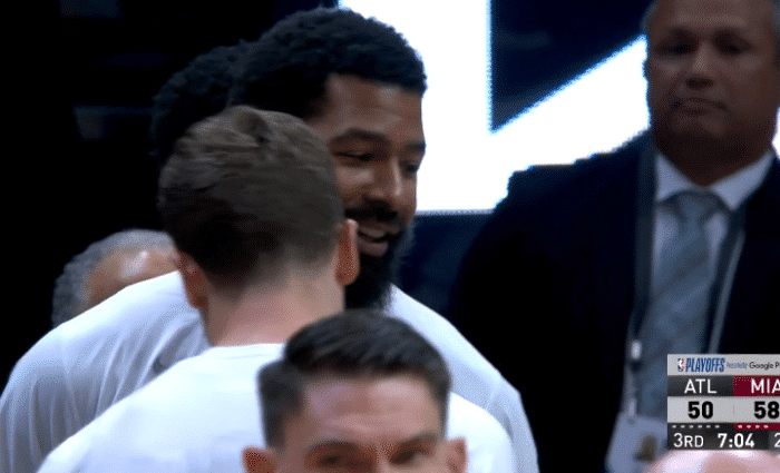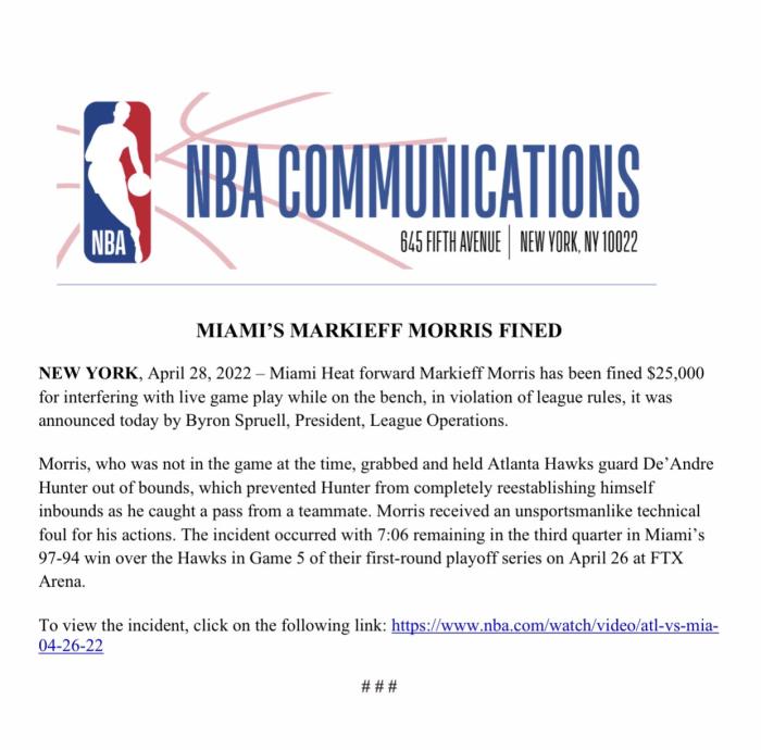 热火和老鹰G5第三节7分04秒,老鹰进攻时,大莫里斯抱住亨特干扰比赛,裁判先是吹罚亨特踩线失误,之后裁判回放并且改判吹罚大莫里斯技术犯规,球权仍旧是老鹰的,裁判给出的理由是大莫的行为违反体育道德;如今联盟追加罚单。