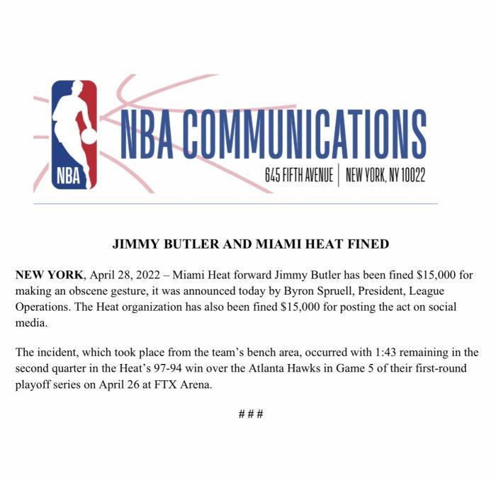 NBA官方宣布,热火球星巴特勒因在对阵老鹰G5的比赛中,在替补席场边做出下流手势(大蛋蛋舞庆祝,这是联盟禁止的庆祝动作),被罚15000美元;热火队因用其下流手势制作动图并发布,也被联盟罚15000美元。