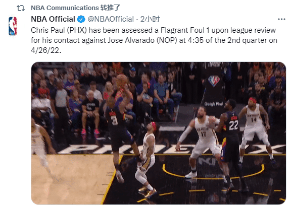 联盟官方宣布,经过联盟审查,因在G5中伸腿踢到了阿尔瓦拉多,保罗被追加一次一级恶意犯规,这一幕发生在G5第二节还剩4分35秒时,保罗跳投时伸脚踢到阿尔瓦拉多,后者捂着裆部痛苦蹲地。
