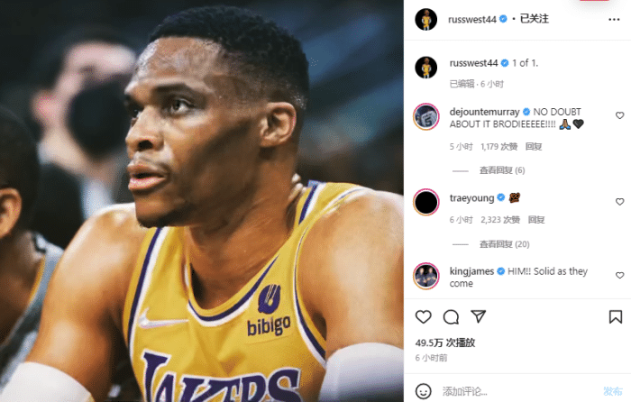 威少清空社媒后首次发声!晒穿湖人球衣照引热议,詹皇力挺:坚实可靠