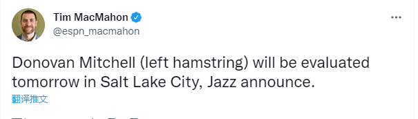 末节米切尔在一次突破上篮落地时遭遇伤病,捂着大腿十分痛苦;4分41秒米切尔受伤下场,捂着大腿一瘸一拐直接离场,并且返回更衣室接受检查;爵士官方已经公布初步伤情,米切尔左腿筋受伤,将在明天回到盐湖城后进行进一步的检查。
