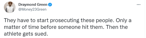 对于这样的事情,勇士球星德拉蒙德-格林发推写道:他们必须开始起诉这些人。有人打他们只是时间问题,然后球员会被起诉。