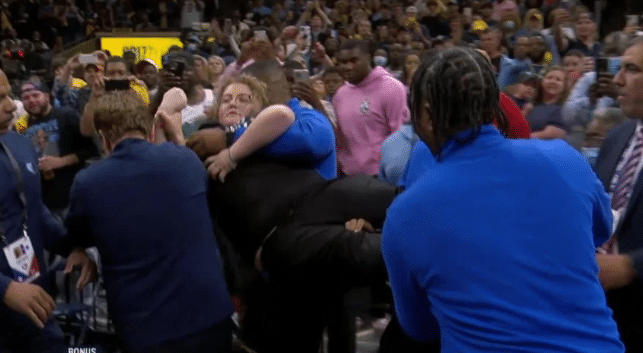 第三节10分50多秒,比赛正在进行,一位女球迷从场边冲进球场,现场安保第一时间冲过来,保安抱摔并且制服这一位女球迷,之后又上来几个壮汉,他们直接把女球迷拖出球场并且赶出球馆;其实,这保安早就盯上她了。