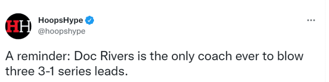 来源:24直播网04-24 13:1124直播网04月24日讯 76人客场102-110不敌猛龙,总比分变成3-1!美媒纷纷刷屏调侃76人主帅里弗斯,好熟悉的3-1啊,欢迎猛龙来到里弗斯的国度!美媒HoopsHype更是很损的第一时间更新社媒:“提醒一下,里弗斯是唯一一个三次3-1领先被翻盘的主教练!”如今,又一个3-1来到面前,里弗斯慌了吗?