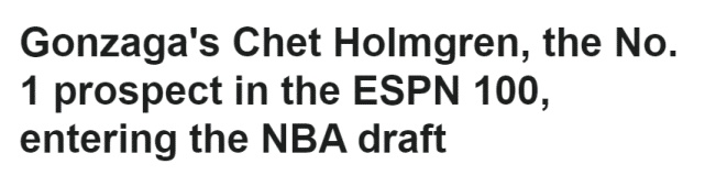 来源:24直播网04-23 15:3524直播网04月23日讯 ,冈扎加大学的19岁新星切特-霍姆格伦告知ESPN,他将正式参加2022年NBA选秀。霍姆格伦身高2米13,在ESPN的TOP 100榜单上排名第一,是状元热门人选之一。