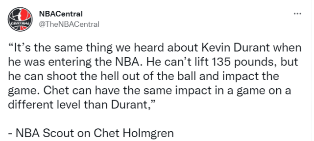 不少美媒把霍姆格伦称为下一个杜兰特。NBA球探也聊过两人的相似之处。“当杜兰特进入NBA时,我们也听到过相同的描述。他不能举起135磅的重量,但他投篮能力很强,而且能够影响比赛。比起杜兰特,切特(霍姆格伦)在不同的层面上对比赛也有类似的影响力。”