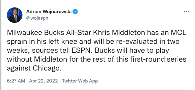 雄鹿和公牛G2的第四节7分30秒,米德尔顿持球突破时不幸摔倒,之后他仍留在场上,但走路有些一瘸一拐,左膝明显不适。米德尔顿又坚持打了不到一分钟后,离场返回更衣室。此前,另一位医学专家Nirav Pandya表示,一名球员遭遇MCL扭伤,平均伤停30天。
