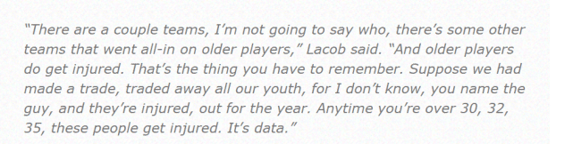 拉科布称赞了普尔的天赋,并表示目前的勇士阵容就是他愿意砸钱看到的阵容。随后他又说:“有些球队,我不会指名道姓,全力以赴地招募老将,却忘了老将容易受伤,这是必须记住的教训。如果我们做了一笔交易,把未来全部送走了,老将却受伤了,甚至缺席一整年。数据显示,超过30岁,32岁,35岁,老球员就是容易受伤。”