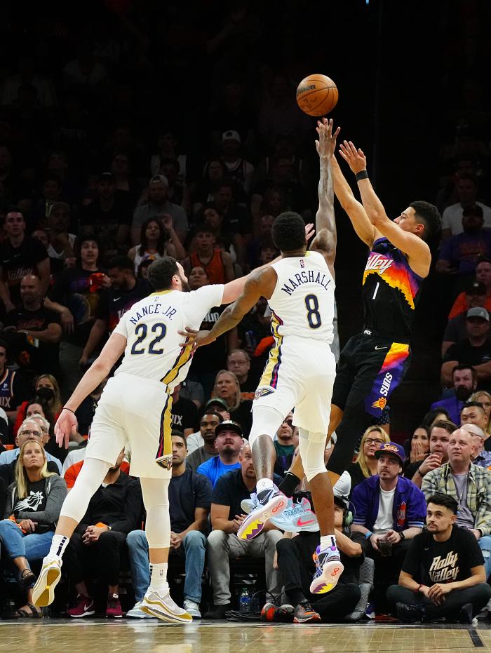 布克半场7记三分追平生涯半场纪录;生涯两次半场30+队史第一;半场30+且0罚球成NBA历史近25年第一人;多次季后赛半场30+7记三分历史首人