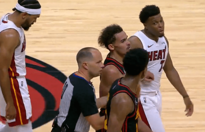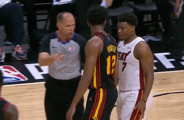 热火和老鹰两队继续比赛,洛瑞和亨特在球场的另一端发生冲突,激烈争吵互喷垃圾话,见状特雷-杨充当和事佬,挡在两人之间并且劝阻亨特;两人被拉开之后,依旧隔空互喷,最终两人都吃到技术犯规。