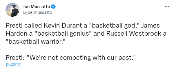 来源:24直播网04-19 15:1224直播网04月19日讯 ,雷霆总经理普雷斯蒂接受媒体采访,公开盛赞昔日的雷霆三少,直言:杜兰特是篮球之神,哈登是篮球天才,威少是篮球战士,还表示:我们不是在和自己的过去竞争。