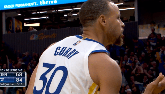下半场,勇三疯又来了,库里连续突破上篮,开始扭屁股跳舞庆祝;汤普森连续命中底角三分,库里更是打成不讲理3+1,再次疯狂怒吼庆祝,约基奇情绪失控,拿球砸地吃到技术犯规;勇士势头不可阻挡,普尔也连中三分,库里突破造考辛斯犯规,主场再次响起MVP呼声。