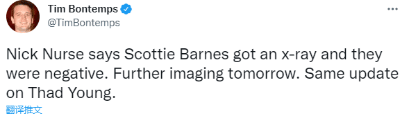NBA季后赛猛龙客场111-131惨败76人,输球还有坏消息,猛龙新星巴恩斯90度崴脚,左脚踝扭伤被迫退赛,赛后巴恩斯接受X光检查,检查结果呈阴性,没有出现骨折的情况,他将在明天接受核磁共振,从而进一步确实伤情。