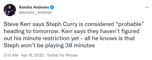 科尔谈到了库里首战的出场时间,表示自己不会让库里打38分钟的。显然,刚刚回归的库里仍有上场时间限制,常规赛他场均打34分钟左右,不少人猜测他在G1应该不会出战超过30分钟。
