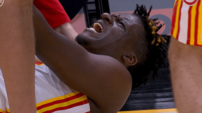 上半场最后几十秒,卡佩拉防守时被莫布里假动作晃飞,随后卡佩拉背后拉人犯规,莫布里被拉倒,结果卡佩拉被倒地的莫布里压伤膝盖,膝盖反关节受伤倒地,捂着膝盖十分痛苦,老鹰队医走上来,之后卡佩拉被两人搀扶离场,一瘸一拐十分难受,右腿无法用力。