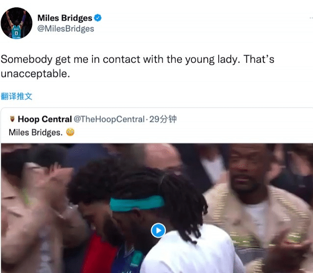 在今天的比赛中,黄蜂队多位核心球员三球、罗齐尔、布里奇斯都不在状态,尤其是布里奇斯,他在今天的比赛中仅仅11投5中得到12分4板4助,而且在比赛末节连续吃到两次技术犯规被裁判驱逐出场,而在驱逐出场的时候,布里奇斯在比赛中做出了不冷静的行为,他在经过球员过道的时候因为不满看台上老鹰球迷的欢呼,愤怒的将自己的牙套扔向看台,但是却砸中了一位女观众,不过布里奇斯很快也针对这件事情进行了道歉,赛后他在自己的社交媒体发文道:“帮我联系一下这位年轻女士。这是不可接受的。”