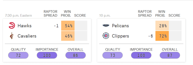 知名数据网站FiveThirtyEight也更新了最后两战的获胜概率。老鹰54%概率晋级,虽然客场作战,他们更被看好一些。至于另一场则有些一边倒,主场作战的快船72%概率胜出。这两组对决的常规赛交锋战绩如何呢?