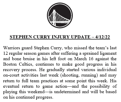 来源:24直播网04-13 15:4824直播网04月13日讯 ,勇士官方更新了斯蒂芬-库里的伤情。官方写道:“勇士后卫库里因伤缺席了最后12场常规赛,继续在他的恢复中取得进展。上周他逐步开始各项个人球场训练(包括投篮、跑步),并可能在本周的某个时刻恢复全队合练。本周末(季后赛首战)能否上场还没确定,这取决于他的恢复。”