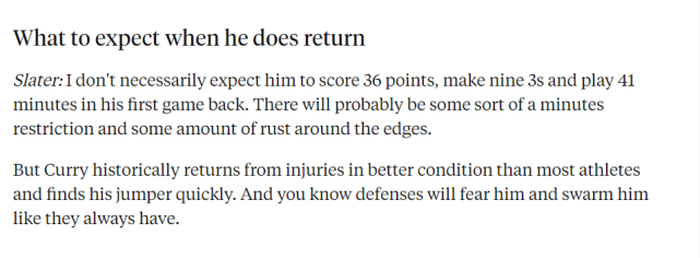 不过从历史上来看,库里从伤病中恢复装填的速度比大多数球员都快,而且能很快找回手感,当然,对方的防守也会像往常一样疯狂针对他。