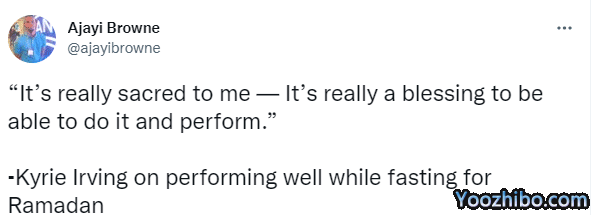 赛后谈到斋月禁食打出出色的表现,欧文表示:这对我来说真的很神圣——能够做到这一点并表现出来真的是一种祝福。