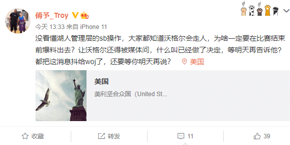 沃格尔被传下课,包括库兹马等也纷纷祝福,但唯独湖人没有正式官宣,虽然没有官方宣布,但谁都知道沃格尔的下课已经是必然。针对这点,名记傅予怒斥湖人管理层,称:“没看懂湖人管理层的操作,大家都知道沃格尔会走人,为啥一定要在比赛结束前爆料出去?让沃格尔还得被媒体问,什么叫已经做了决定,等明天再告诉他? 都把这消息抖给woj了,还要等你明天再说? ”