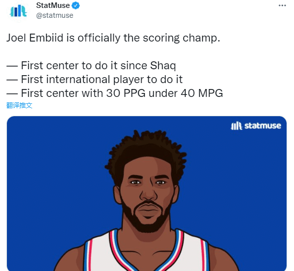 恩比德成为1999-2000赛季沙奎尔-奥尼尔以来第一位中锋得分王;