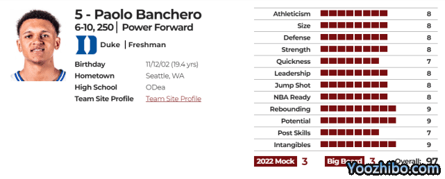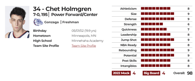 再来看看同样有实力竞争状元的切特-霍姆格伦。他身高2米13,体重88公斤,选秀模板是波尔津吉斯,也有美媒认为他的身上有杜兰特的影子。NBADRAFT给他打出的能力总评分是98分,体型、防守、跳投、篮板、潜力都打了9分的高分,相对较低的是力量和速度,力量只有6分,速度是7分。