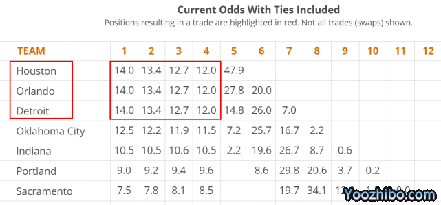 来源:24直播网04-09 16:4424直播网04月09日讯 ,根据目前的球队战绩排名,火箭、魔术和活塞是本赛季成绩最差的三支球队,在抽签概率方面,他们同样拥有14%的状元签概率、13.4%的榜眼签概率,12.7%的探花签概率,抽到4号签的概率也同为12%。上赛季得到状元签的是活塞,今年的状元签又将花落谁家?北京时间5月18日,NBA抽签仪式将在芝加哥进行,答案将在那时候揭晓。