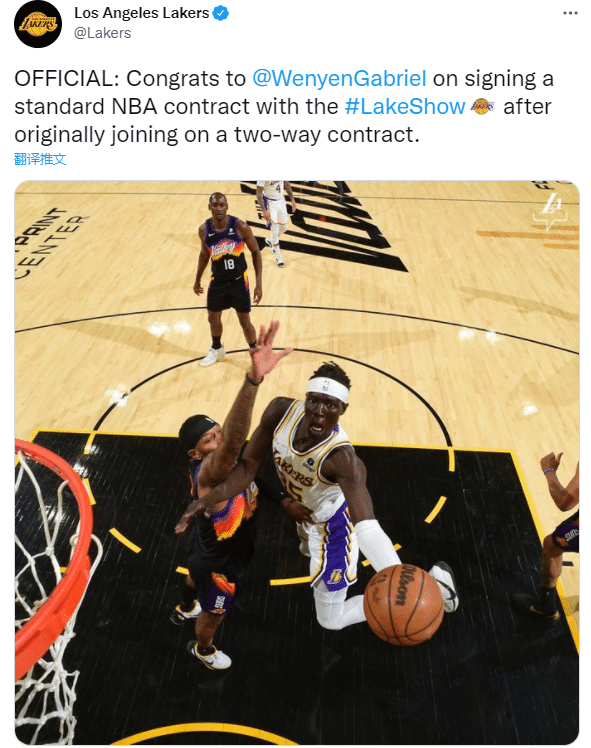 湖人官宣正式转正加布里埃尔,官方声明:恭喜双向合同球员加布里埃尔与球队签下一份正式合同;他可能下赛季继续留在湖人,新签2年合同,湖人拥有球队选项。