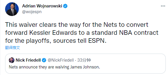 NBA常规赛收官阶段,篮网正式裁掉悍将詹姆斯-约翰逊,腾出一个名额,将和爱德华兹新签一份正式合同,这样的话,爱德华兹有资格为篮网参加季后赛。