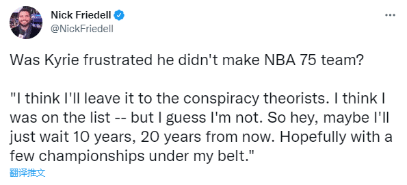 谈到了自己落选75大球星的话题,欧文表示:这些东西就留给阴谋论者去讨论吧,我认为自己能够排在75大之中,但可惜的是我并不在名单上。或许要入选还要等个十年二十年,并且希望我能多夺得几个总冠军。