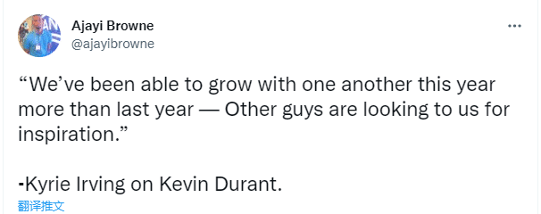 谈到杜兰特,欧文表示:相比去年,我们今年更能够与彼此一起成长,队友们能从我们这得到激励;杜兰特知道我在他身边是一个杀手,我们觉得我们可以在篮网打出自己的一片天地,给这支球队留下我们的印记,我认为我们不会后悔当初(一起打球)的决定。