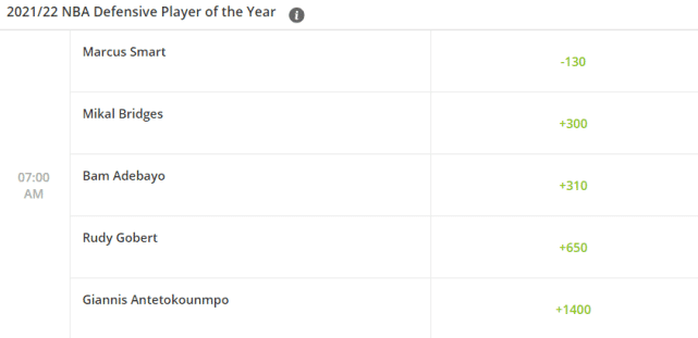 来源:24直播网04-06 17:2524直播网04月06日讯 2021-22赛季的常规赛临近尾声,各大奖项的归属成为球迷关注的焦点之一。北京时间4月5日,NBA五大奖项的最新赔率出炉。五个奖项中,竞争比较激烈的是最佳新人奖、常规赛MVP和年度最佳防守球员奖,而悬念最小的是最佳第六人奖,从赔率来看,甚至可以说是毫无悬念了。