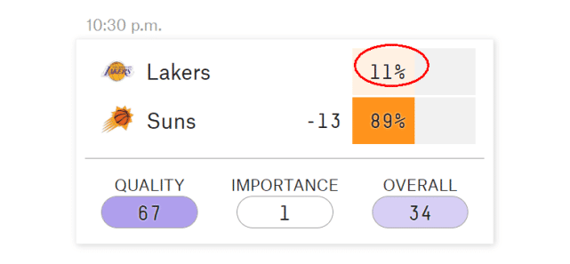 数据网站538并不看好湖人下一场对阵太阳的胜算。最新列出的获胜概率显示,湖人本场比赛的获胜概率仅为11%!此前也是这家网站认为湖人只有0.2%的概率晋级季后赛。最新消息是太阳将全主力出战这场比赛。