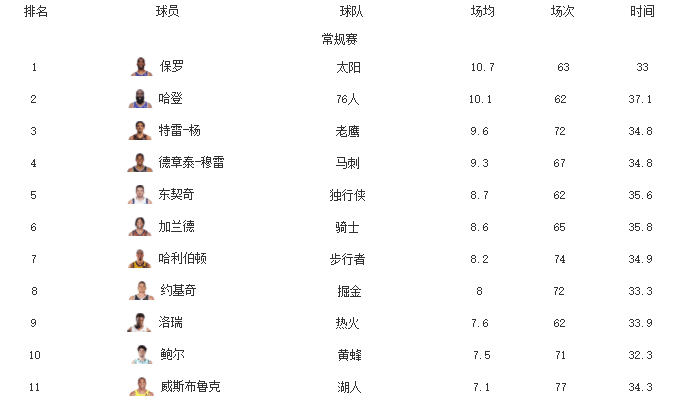助攻王层面保罗力压哈登,保罗场均10.7次助攻,哈登10.1次助攻。保罗在全明星前后受伤,给了哈登机会,可惜这位前队友没有把握住机会,他连续6场比赛助攻数没有上双,直接被保罗甩开,确实很遗憾。