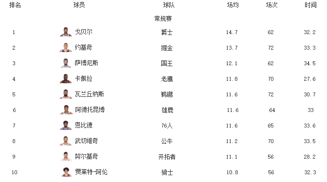 篮板王没有悬念,爵士中锋、最佳防守球员戈贝尔遥遥领跑,他场均可以摘下14.7个篮板球,可以说是断层领跑。掘金的约基奇场均13.7个篮板球、萨博尼斯12.1个。去年的NBA篮板王老鹰悍将卡佩拉,今年只有场均11.8个篮板。