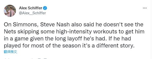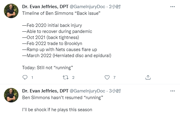 Evan Jeffries列出西蒙斯的背伤时间线——2020年2月最初的背部受伤,2021年10月(背部紧张) ;2022年2月被交易至布鲁克林,与篮网一起训练导致背伤复发 ;2022年3月遭遇腰椎间盘突出并接受硬膜外注射治疗,时至今日,西蒙斯还不能奔跑。