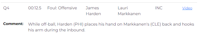 裁判报告!76人获利漏吹哈登夹手臂进攻犯规,骑士输球主帅被罚太冤