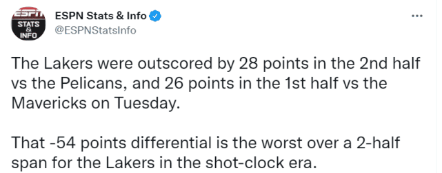 24直播网03月31日讯 ,ESPN数据显示,对独行侠一战的上半场湖人56-82净负26分,而对鹈鹕的下半场比赛,湖人39-67净负28分。湖人连续两个半场累计净负54分,创下队史计时器时代连续两个半场失分的最高纪录。