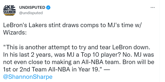 夏普则从另一个角度解读了这种对比。他说:“在生涯最后两个赛季,乔丹还是联盟前十的球员吗?不,他甚至没有接近入选最佳阵容,但詹姆斯会在他的生涯第19个赛季成为一阵或者二阵的球员。”