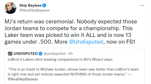 本赛季,37岁的詹姆斯打出很好的状态,目前场均30.1分8.2篮板6.3助攻,但湖人本赛季表现糟糕。有美媒和球迷提到了奇才时期的迈克尔-乔丹。对此,贝勒斯的回应是:“这是对乔丹的侮辱,就目前情况来看,乔丹的奇才是比詹姆斯的湖人更好的球队,而且,没有人对乔丹的那支球队抱有任何期望。”