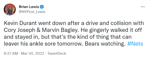 此前,湖人的詹姆斯也扭到脚踝,并缺席了今天对独行侠的比赛。杜兰特崴脚这一幕自然也令球迷非常担心。篮网记者描述了杜兰特的崴脚过程后写道:“他决定留在比赛中,但这是可能导致他明天脚踝酸痛的事。”
